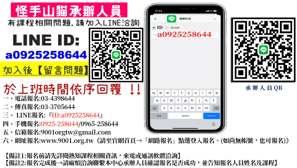 報名完成後 請麻煩聯繫確認本單位-專案承辦小姐,並且告知報名人員姓名及報名地區,以便往後通知聯繫考證訓練課程 :中華技能-李小姐【
