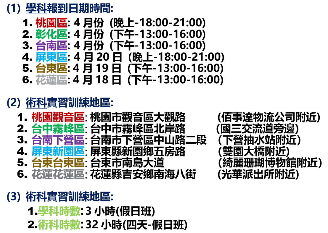 2.因補助相關規定,請報名學員提早準時報到到各區域完成報到手續,以便補助名額保留。