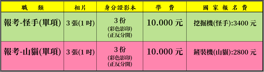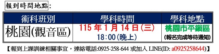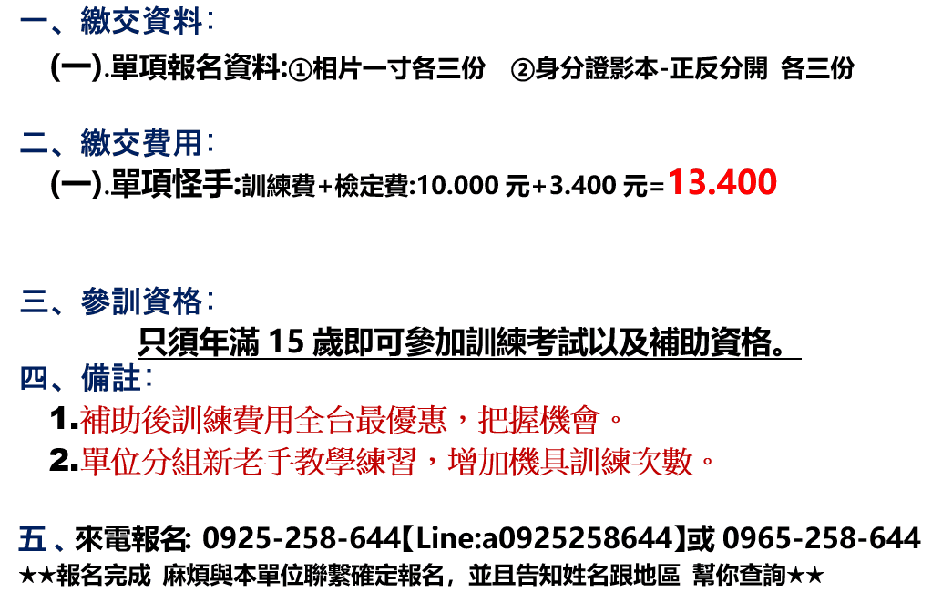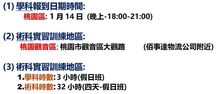 備註:(需網路線上報名) 學科:3小時,術科:32小時(四天假日)