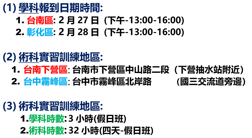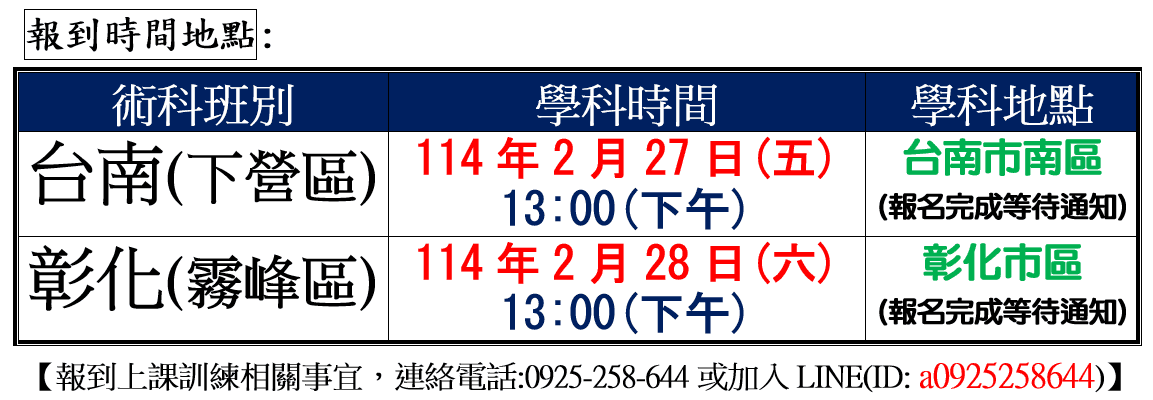 備註:(需網路線上報名) 學科:3小時,術科:32小時(四天連續假日)