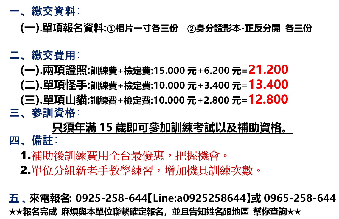 配合勞動部勞動力發展署技能檢定中心公告,參加技術士技能檢定測驗,取得技術士證照 ,方可操作資格。