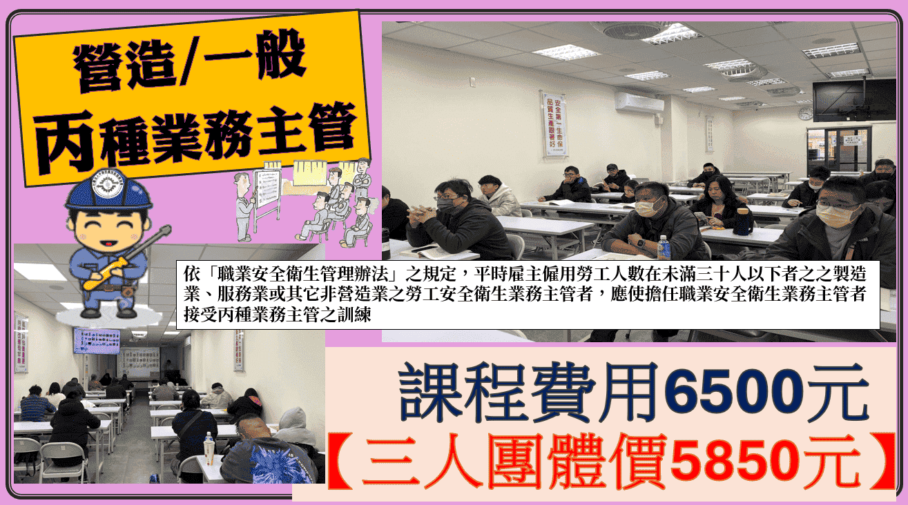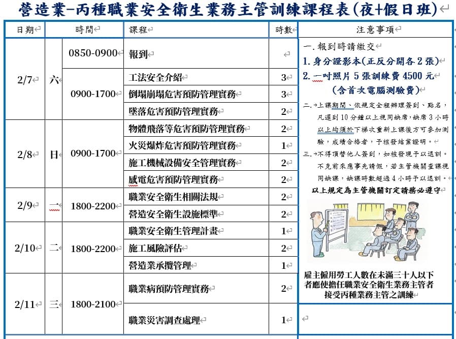 營造業或工程業廠商請注意:自98年1月8日起,職業安全衛生管理員結業證書,不能兼任營造業甲、乙、丙種業務主管使用;需取得勞安乙級技術士證照,方為合格勞安管理員。(或另上營造業業務主管課程)