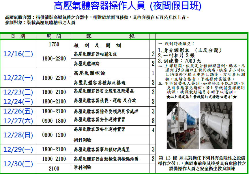 第 13 條 雇主對擔任下列具有危險性之設備操作之勞工,應於事前使其接受具有危險性之設備操作人員之安全衛生教育訓練:高壓氣體容器操作人員。