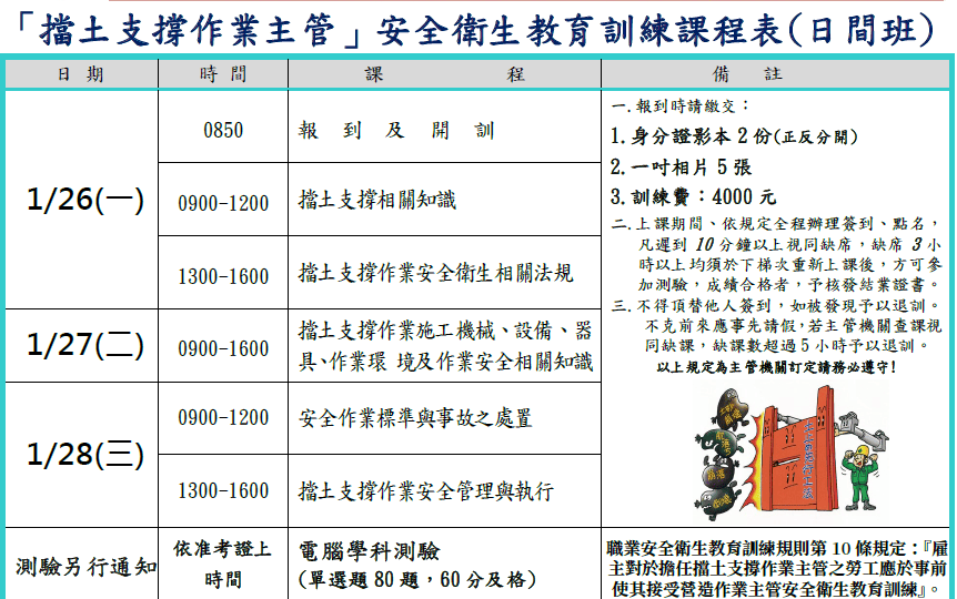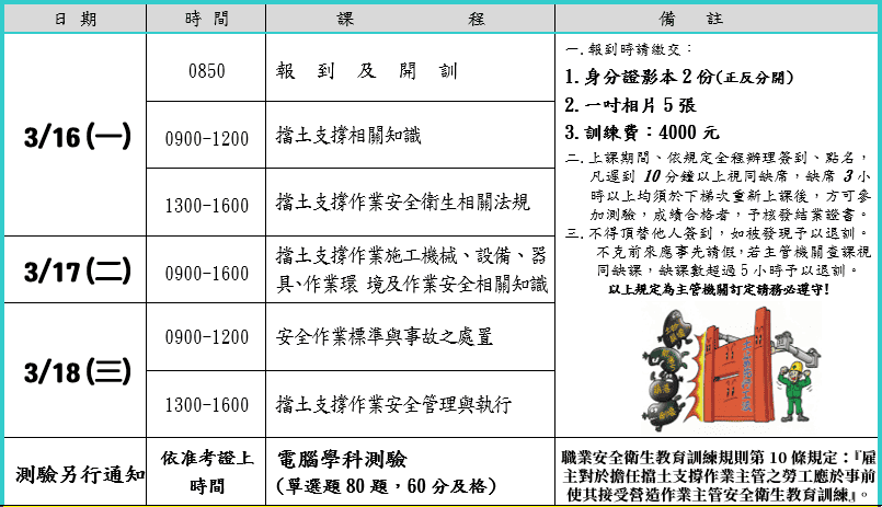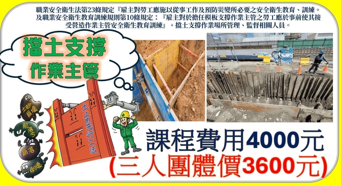 職業安全衛生法第23條規定『雇主對勞工應施以從事工作及預防災變所必要之安全衛生教育、訓練。及職業安全衛生教育訓練規則第10條規定:『雇主對於擔任擋土支撐作業主管之勞工應於事前使其接受營造作業主管安全衛生教育訓練』。