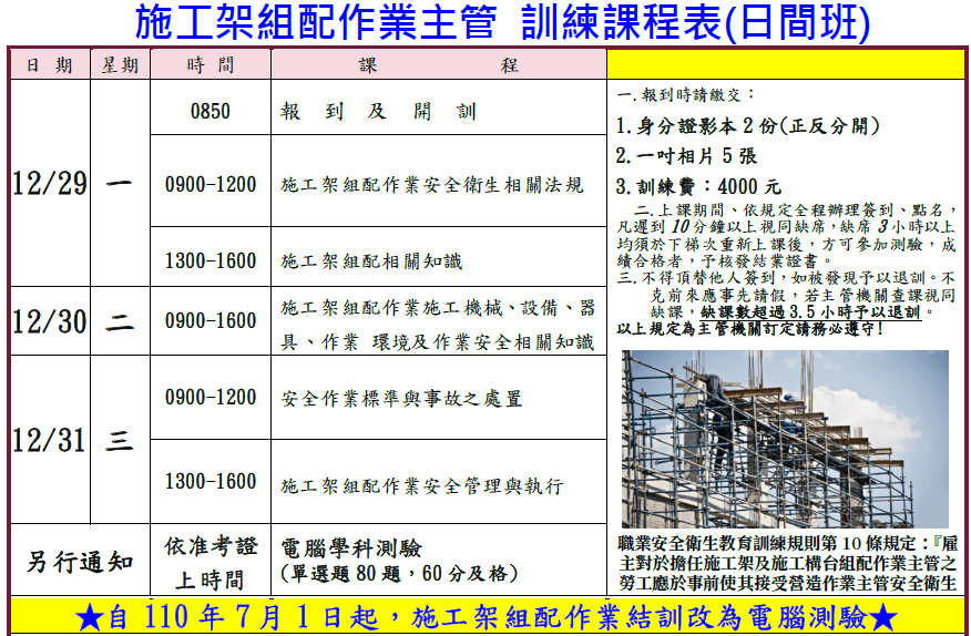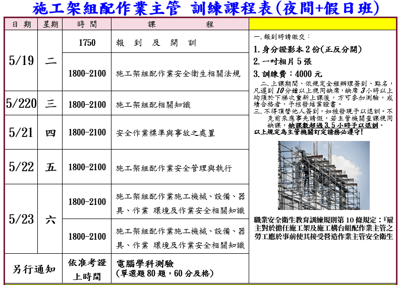 職業安全衛生法第23條規定『雇主對勞工應施以從事工作及預防災變所必要之安全衛生教育、訓練。及職業安全衛生教育訓練規則第10條規定:『雇主對於擔任施工架及施工構台組配作業主管之勞工應於事前使其接受營造作業主管安全衛生教育訓練』。