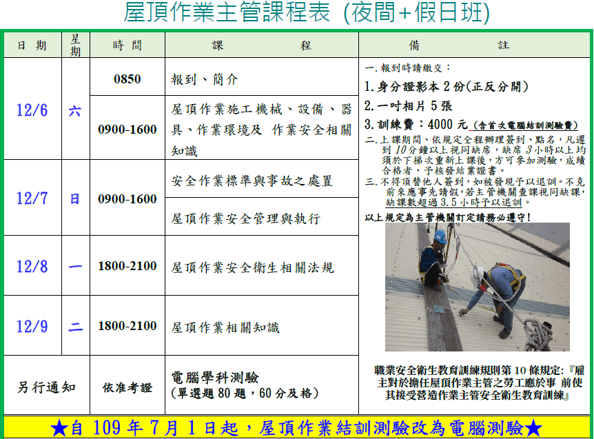 職業安全衛生法第23條規定『雇主對勞工應施以從事工作及預防災變所必要之安全衛生教育、 訓練。及職業安全衛生教育訓練規則第10條規定:『雇主對於擔任屋頂作業主管之勞工應於事 前使其接受營造作業主管安全衛生教育訓練』。
