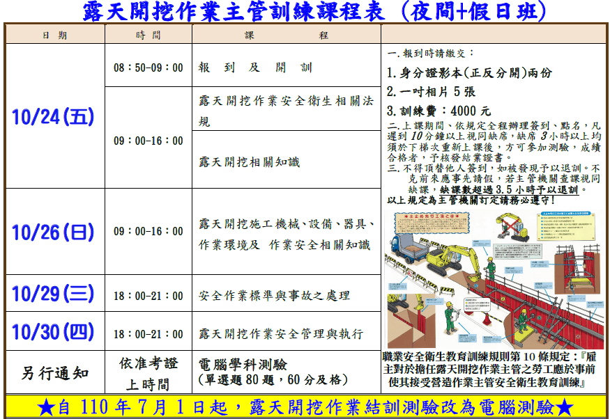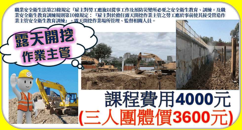 職業安全衛生法第23條規定『雇主對勞工應施以從事工作及預防災變所必要之安全衛生教育、訓練。及職業安全衛生教育訓練規則第10條規定:『雇主對於擔任露天開挖作業主管之勞工應於事前使其接受營造作業主管安全衛生教育訓練』。