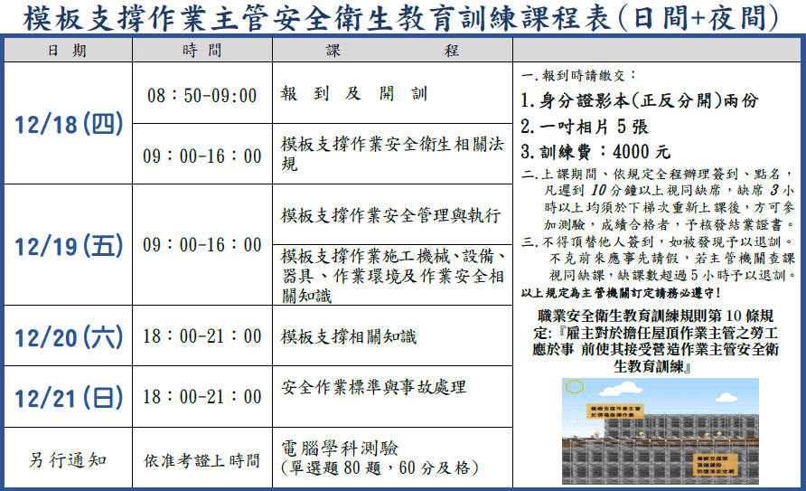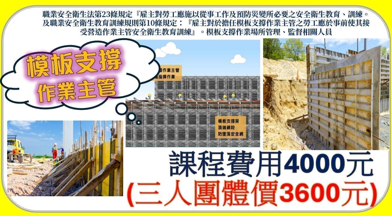 職業安全衛生法第23條規定『雇主對勞工應施以從事工作及預防災變所必要之安全衛生教育、訓練。及職業安全衛生教育訓練規則第10條規定:『雇主對於擔任模板支撐作業主管之勞工應於事前使其接受營造作業主管安全衛生教育訓練』。