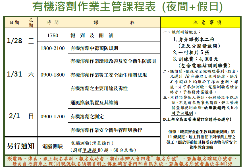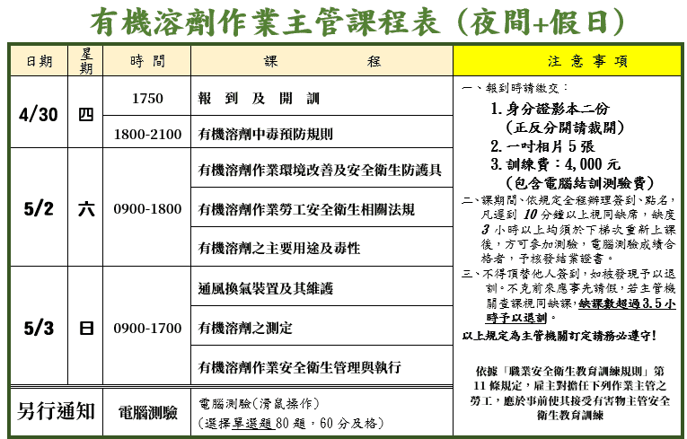 依據「職業安全衛生教育訓練規則」第11條規定,雇主對擔任下列作業主管之勞工,應於事前使其接受有害物主管安全衛生教育訓練。如有機溶劑、鉛作業、四烷基鉛、缺氧作業、特定化學、粉塵作業、高壓室內作業等主管人員皆須接受18小時專業訓練。