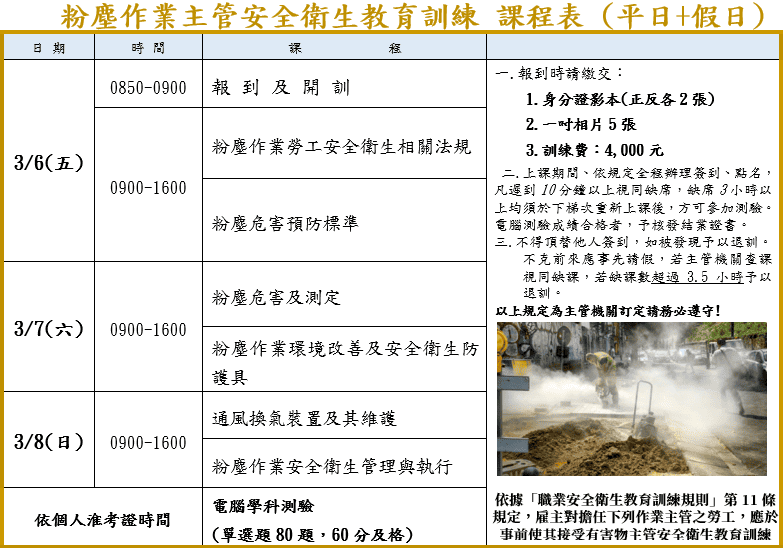 食品加工廠、飼料廠、水泥業、麵粉及紙類加工廠粉塵作業場所管理、監督相關人員。