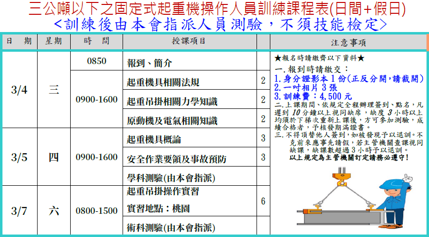 未滿三公噸固定式起重機操作人員(天車)【新訓】