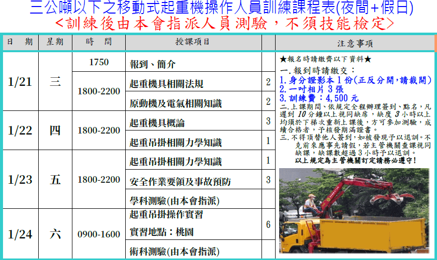 未滿三公噸移動式起重機操作人員(吊車)【新訓】
