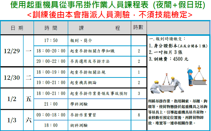 備註:學科:12/29、12/30、1/2(夜間),術科:1/3(假日)