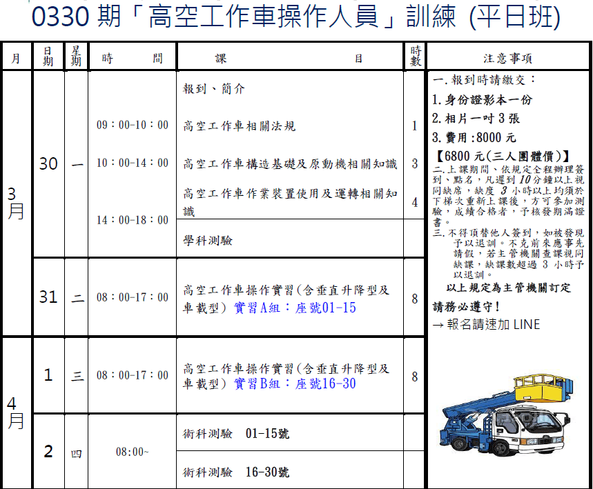 備註:學科3/26、3/27(夜間),術科:3/28、3/29(日間),測驗:3/30(半天)