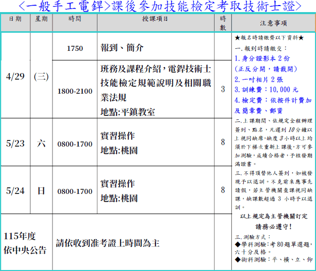 備註:學科:4/29(夜間),術科:5/23、5/24(假日)