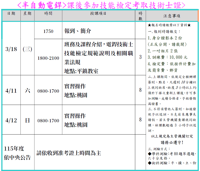 115年03月18日~115年04月12日/桃園市平鎮區/夜/假日班/