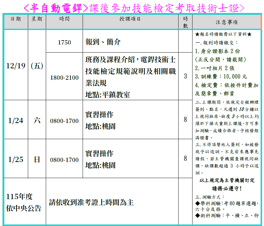備註:學科:12/19(夜間),術科:1/24、1/25(假日)