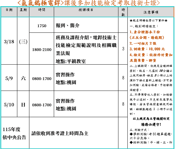 備註:學科:3/18(夜間),術科:4/11、4/12(假日)