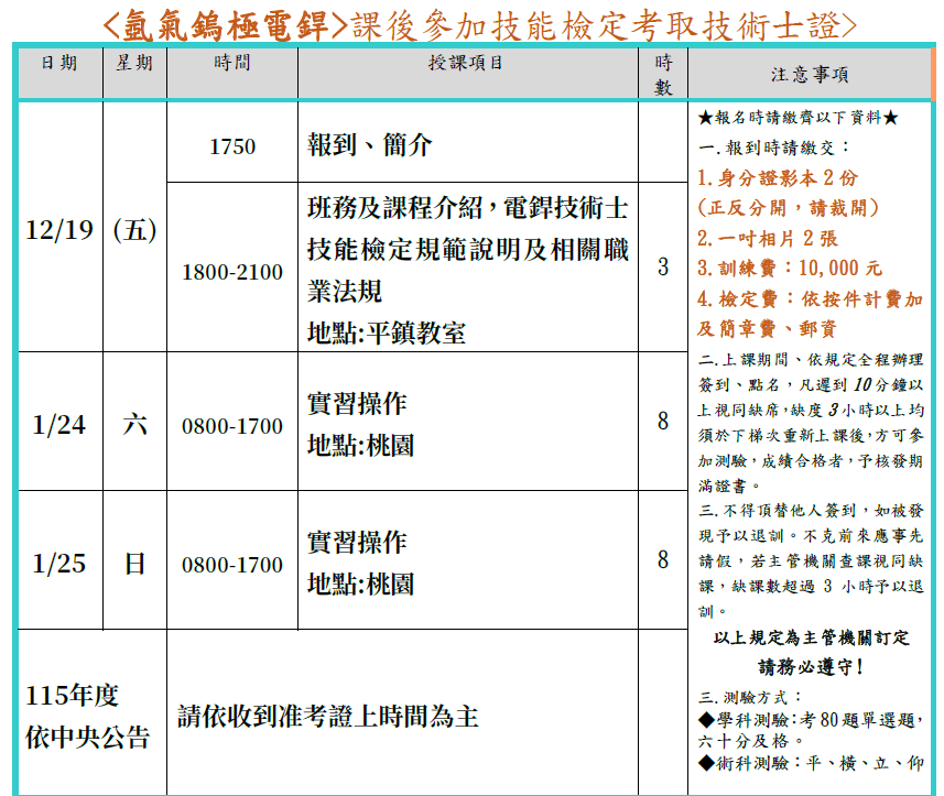 備註:學科:12/19(夜間),術科:1/24、1/25(假日)