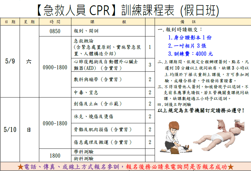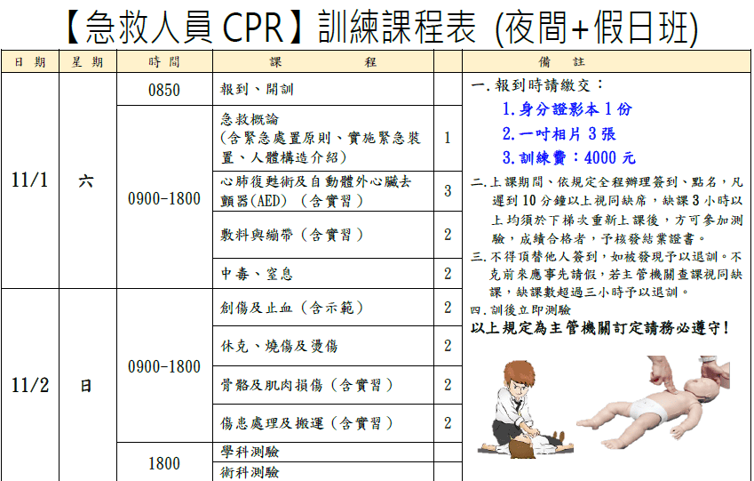 ● 訓練資格:不得有失能、耳聾、色盲、心臟病、兩眼裸視或矯正視力後均在零點六以下等體能及健康不良,足以妨礙急救事宜者。