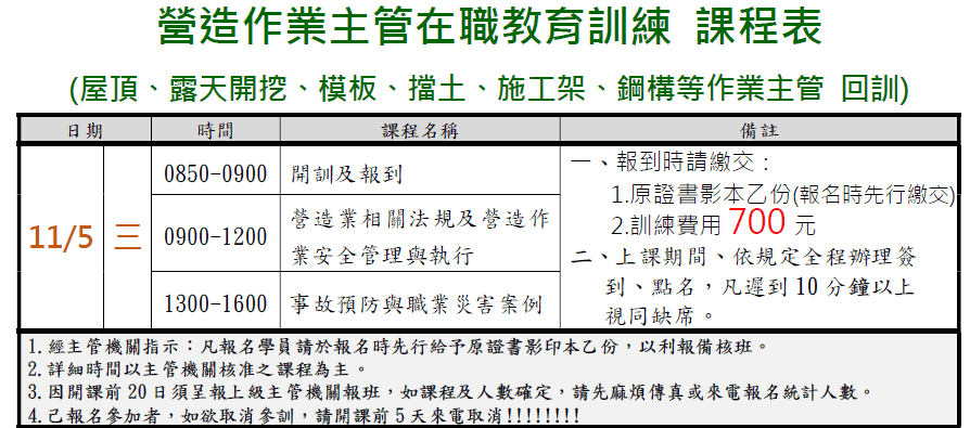 一、依據「職業安全衛生教育訓練規則第18條」規定,凡持有工安相關證書者須依其工作需求,定期參與在職訓練課程。
