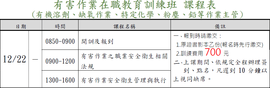一、依據「職業安全衛生教育訓練規則第18條」規定,凡持有工安相關證書者須依其工作需求,定期參與在職訓練課程。