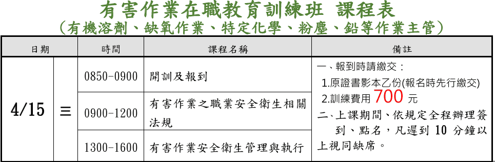 | 7. | 特定有害作業(如有機溶劑、鉛、特定化學物質等)的作業安全衛生法規 | 3小時 |