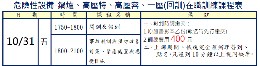 一、依據「職業安全衛生教育訓練規則第18條」規定,凡持有工安相關證書者須依其工作需求,定期參與在職訓練課程。