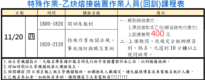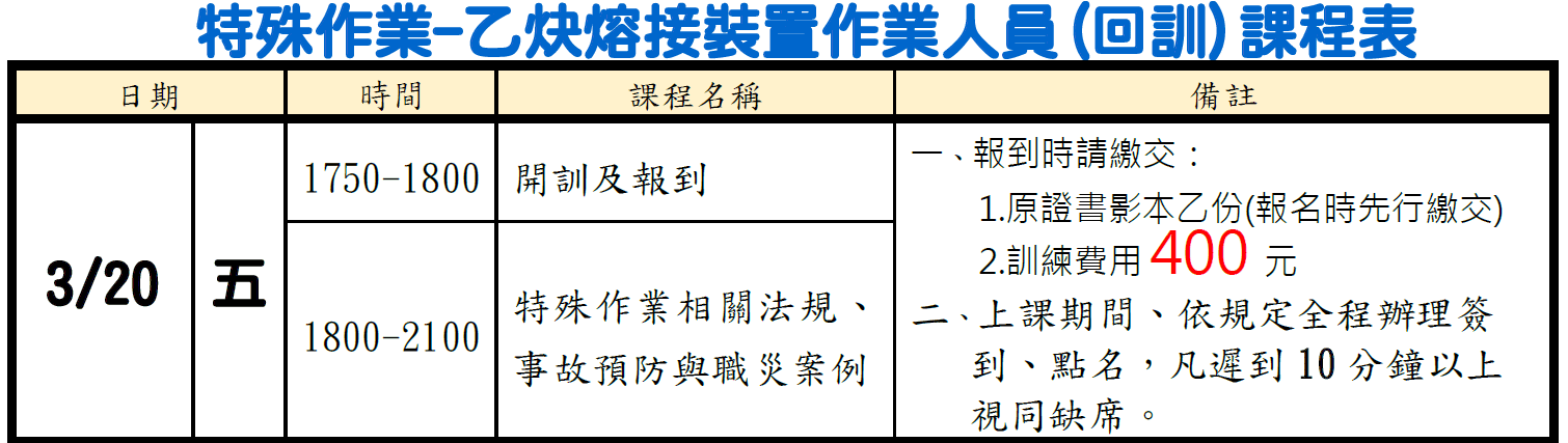 | 3 | 安全作業要領與事故預防 | 3小時 |