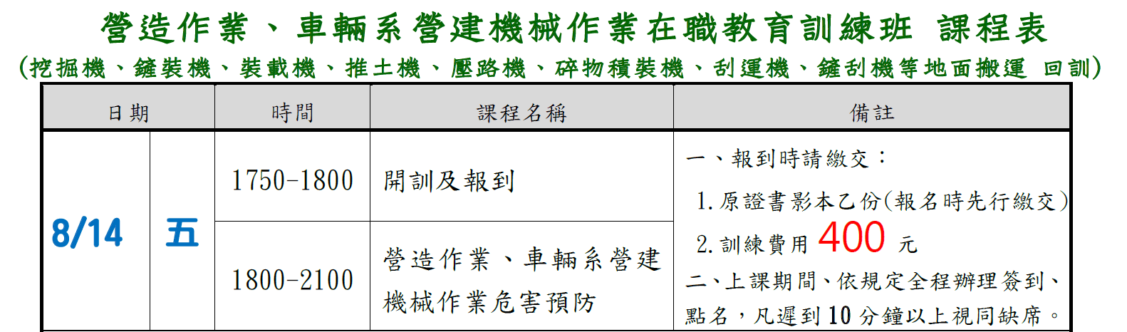| 4. | 營建車輛機具作業範圍與安全守則 | 3小時 |