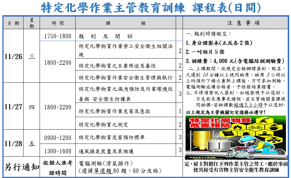 依據「職業安全衛生教育訓練規則」第11條規定,雇主對擔任下列作業主管之勞工,應於事前使其接受有害物主管安全衛生教育訓練。如有機溶劑、鉛作業、四烷基鉛、缺氧作業、特定化學、粉塵作業、高壓室內作業等主管人員皆須接受18小時專業訓練。