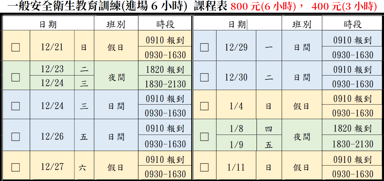 3.一般新進員工或在職於變更工作之勞工。 4.職業安全衛生委員會成員 5.工地進場作業之職前訓練。