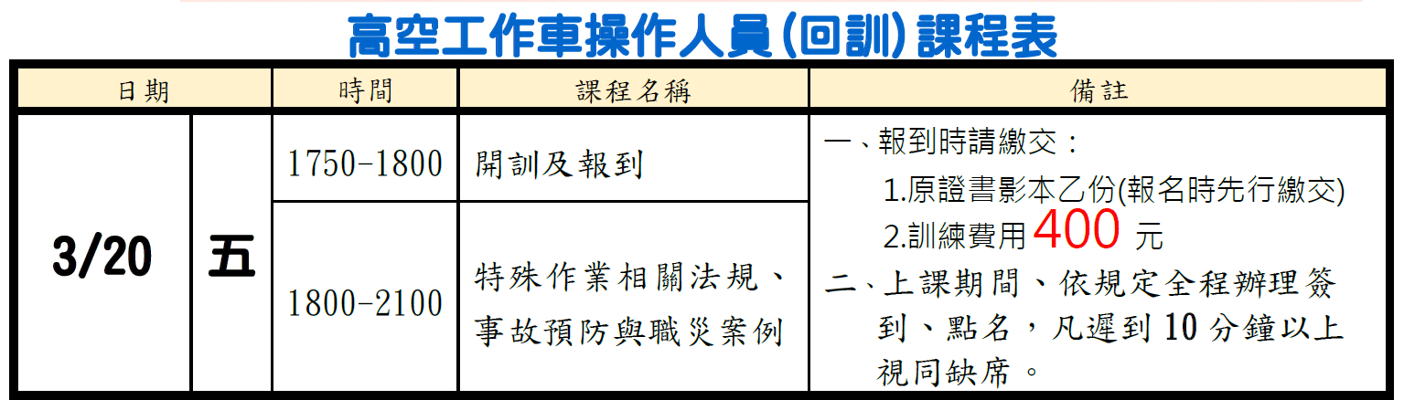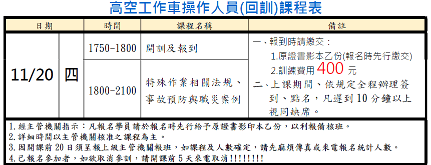 | 5. | 高空車操作員相關法規及案例檢討 | 3小時 |
