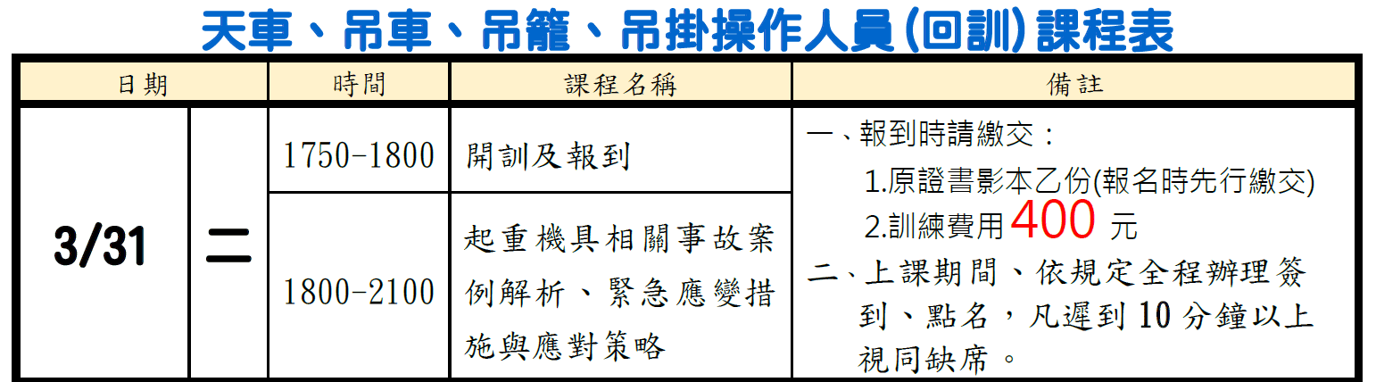 | 1. | 起重機具事故預防 | 3小時 |