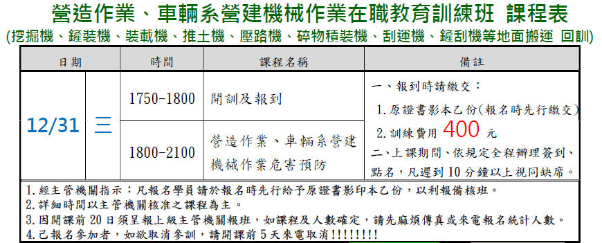 | 4. | 營建車輛機具作業範圍與安全守則 | 3小時 |