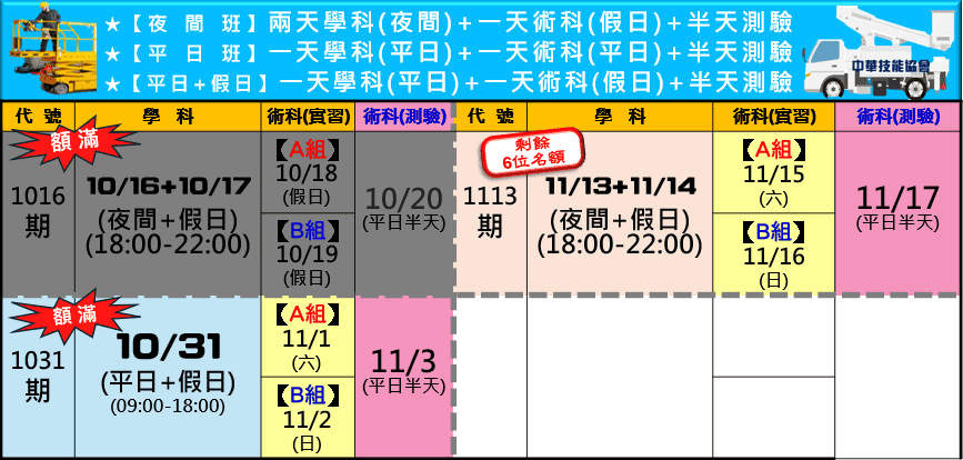 【高空工作車】 操作人員訓練班 注意事項 勞動部公告: 自113年1月1日起,雇主對於高空工作車,應指派經特殊作業安全衛生教育訓練及測驗合格之人員操作。如有違反規定者,將依法處罰新台幣3萬到30萬罰鍰。 適用對象 高空工作車之走行裝置概分為自走式及車載式,升降裝置則分為垂直升降、直臂式及屈臂式,常用於電力供應、電信、建築、土木、運輸、倉儲及廣告招牌等行業,其操作需具備相關專業知識及技能。 高空工作車-報名網址(點入):線上報名【點入⬇】 填寫完成後,請加入官方@9001tw確認報名 來電洽詢:03-4398644 線上報名【點入⬇】 線上報名【點入⬇】